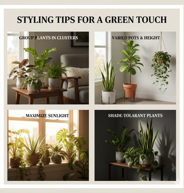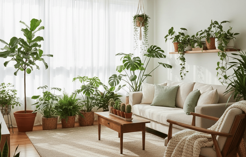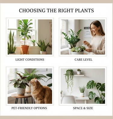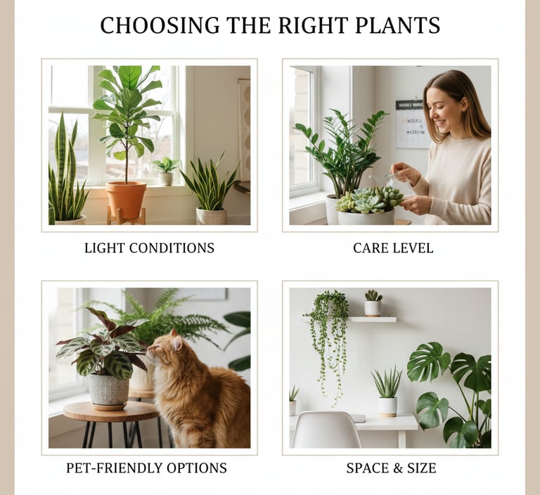 Select plants based on light availability, maintenance level, and style preference. Low-maintenance options like snake plants, pothos, or ZZ plants are perfect for beginners, while ferns, palms, and fiddle leaf figs add dramatic greenery to larger spaces. Consider a mix of sizes, shapes, and textures to create visual interest.