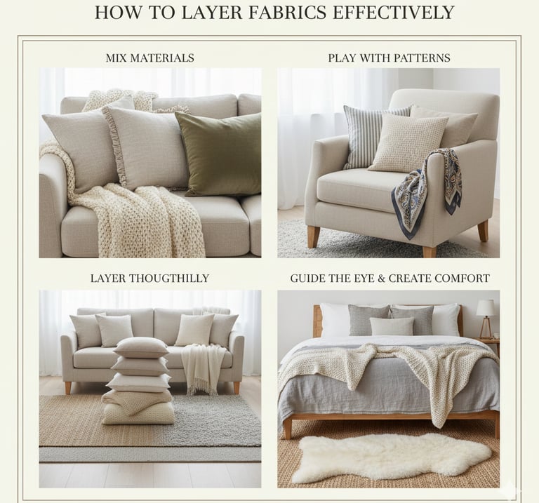 Mix materials: Combine cotton, linen, wool, and velvet to create visual and tactile contrast.