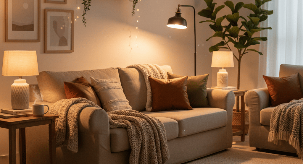 Layer light sources: Combine table lamps, floor lamps, and string lights for depth.